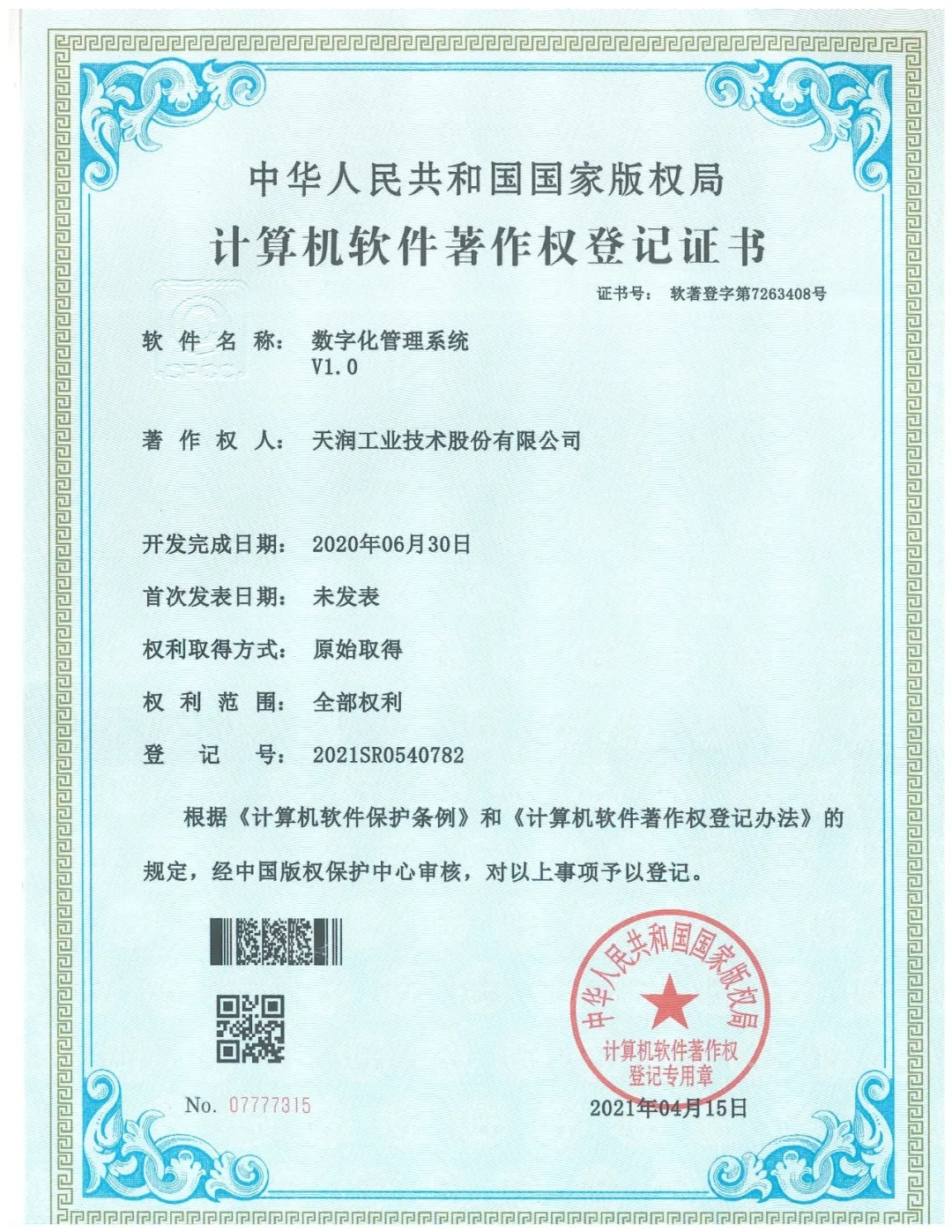 ¿ËÈÕ£¬£¬£¬£¬£¬£¬ÓÉÎÒ¹«Ë¾ÆóÒµ¹ÜÀí²¿ÐÅÏ¢ÖÐÐÄ×ÔÖ÷Ñз¢µÄÊý×Ö»¯¹ÜÀíϵͳ,»ñµÃ¹ú¼Ò°æÈ¨¾ÖÈÏÖ¤µÄÅÌËã»úÈí¼þÖø×÷Ȩ¹ÒºÅÖ¤Êé,±ê¼Ç×ÅÎÒ¹«Ë¾µÄÊý×Ö»¯¹ÜÀíϵͳӵÓÐ×ÔÁ¦µÄ×ÔÖ÷֪ʶ²úȨ£¬£¬£¬£¬£¬£¬¹«Ë¾Öǻ۹¤³§Êý×Ö»¯½¨ÉèÈ¡µÃÖØ´óÍ»ÆÆ,¾ßÓÐÀï³Ì±®µÄÒâÒå¡£¡£¡£¡£¡£¡£